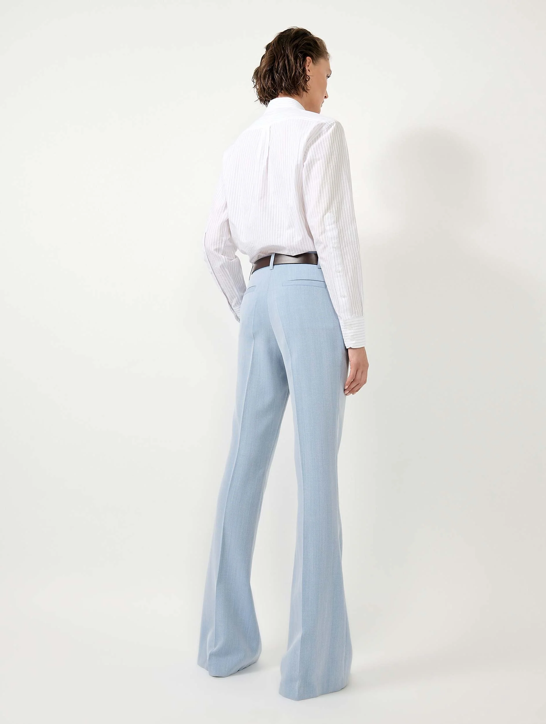 Confectionné dans un crêpe bleu ciel aux délicats motifs chevrons, ce pantalon de costume apporte une allure à la fois sartoriale et féminine à vos événements et cérémonies de saison. Sa coupe bootleg, qui s’évase subtilement au niveau de la cheville, accompagne avec élégance la pointe d’une sandale à talons, tandis que le pli marqué le long de la jambe souligne la netteté de ses lignes. Porté avec la veste assortie ou simplement associé à une chemise rayée, ce pantalon tailleur s’impose comme une pièce aussi raffinée que polyvalente.
